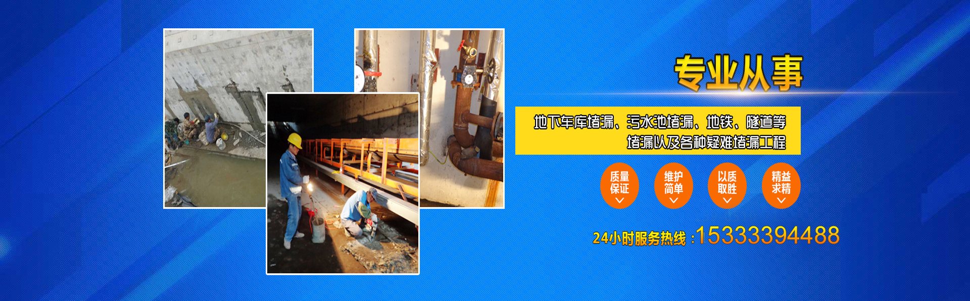我们是一家专业承接防水堵漏施工维修的企业。拥有一流的堵漏工程技术专家,施工管理人员,先进的施工技术工艺和专业的施工队伍。致力于人防地下室,卫生间,厨房,隧道等砖砼结构建筑的渗漏水等问题的研究,专业从事纳米反压注浆工艺技术的推广及应用真诚为您服务,帮您解决渗漏水问题的后顾之忧,愿与国内同仁一道为中国的防水堵漏技术的创新与应用作出我们应有的贡献!